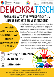 Die Initiative "Gemeinsam für Demokratie" lädt alle Interessierten herzlich ein, um genau darüber zu sprechen. Ab 10:30 Uhr ist der Tisch reserviert und man kann in Ruhe ankommen. Unsere Diskussion startet um 11:00 Uhr.